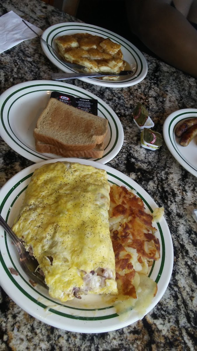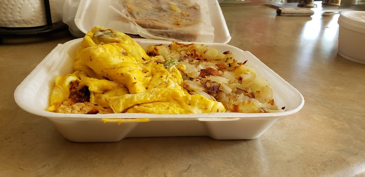 Best Meal I've had from an omelet Albanian Omelette Ham, bacon, sausage and corned beef with grilled onions, green peppers, swiss and American cheese.